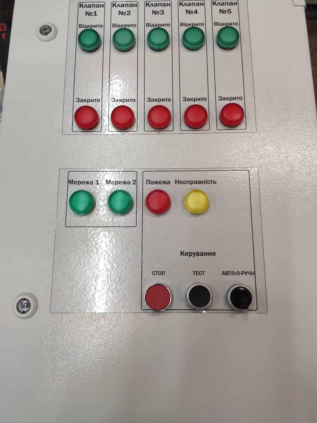 Шафа керування виконана для Замовника. Виконує задачу керування клапанами на об'єкті Замовника. Керування відбувається за допомогою контролерів. Є режим тестування системи.