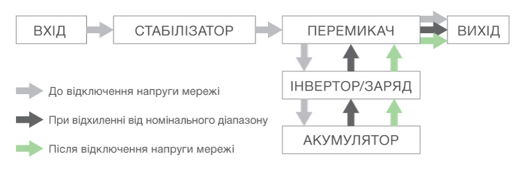 В роботі електроспоживачів НЕ буде перешкод через зникнення напруги мережі, - інверторний модуль перейде на роботу від акумулятора. Час автономної роботи буде обмежено тільки характеристикою: ємність акумулятора і потужністю підключених споживачів. Типовий* час роботи від типового** вбудованого акумулятора в залежності від навантаження показано в таблиці: